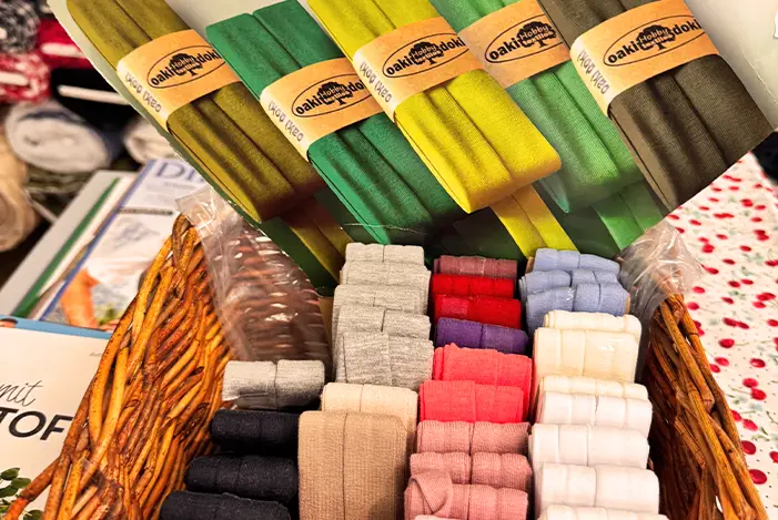 In unserer großen Zubehörabteilung gibt es Nähseiden, Garne, Bänder, Spitzen, Gummi, Knöpfe, Schnallen, Verschlüsse, Drucker, Stecknadeln, Sicherheitsnadeln, Nähnadeln, Stricknadeln, Aufnäher und Bügelmotive, Scheren, Maßbänder, Schulterpolster, Zwirn, Schneiderkreiden, Fingerhüte, Nähmaschinenöl, Klettverschlüsse, und vieles mehr.